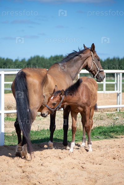Кобыла с жеребенком в загоне на пастбище
