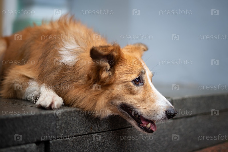 Милая собака лежит на ступеньках с внимательным взглядом и готова к бегу