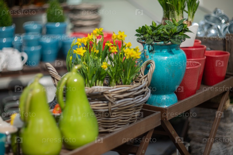 Красочная керамика и свежие цветы на прилавке весенней ярмарки товаров для дома