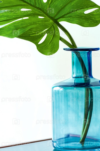 Лист монстеры в синей стеклянной бутылке