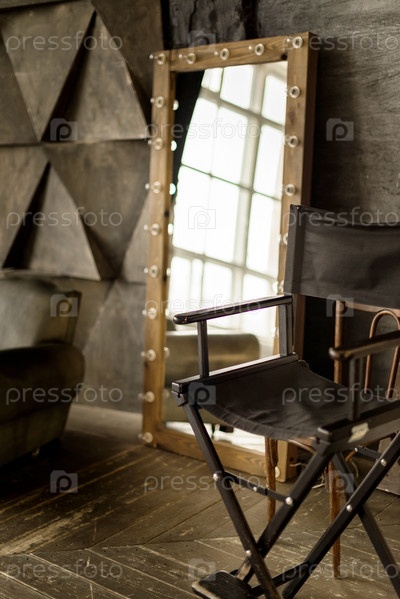 Пустой стул в парикмахерской и зеркало на стене со светлым отражением