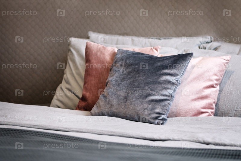 Стопка сложенных декоративных подушек на кровати
