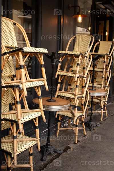 Штабелированные стулья в закрытом уличном кафе в межсезонье