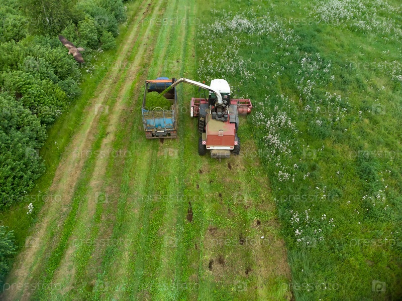 Вид с воздуха на комбайн, работающий на большом сельскохозяйственном поле