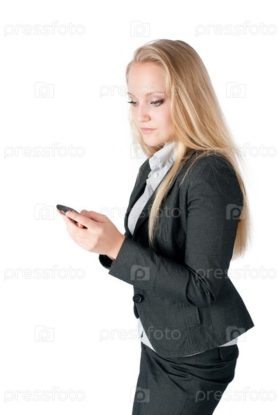 Молодая женщина читает короткое сообщение на мобильном телефоне, изолированном на белом фоне