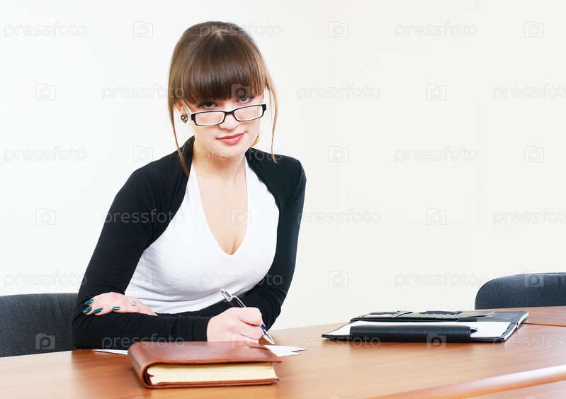 Привлекательная деловая женщина в офисе с личным органайзером