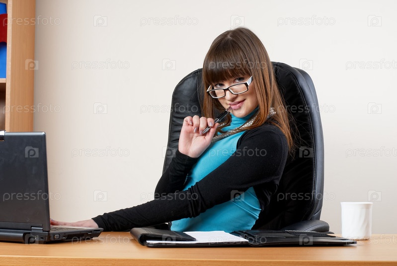 Молодая красивая бизнес-леди - начальник, сидящий на стуле в офисе