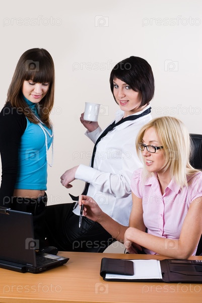 Три красивые деловые женщины, работающие с ноутбуком в офисе