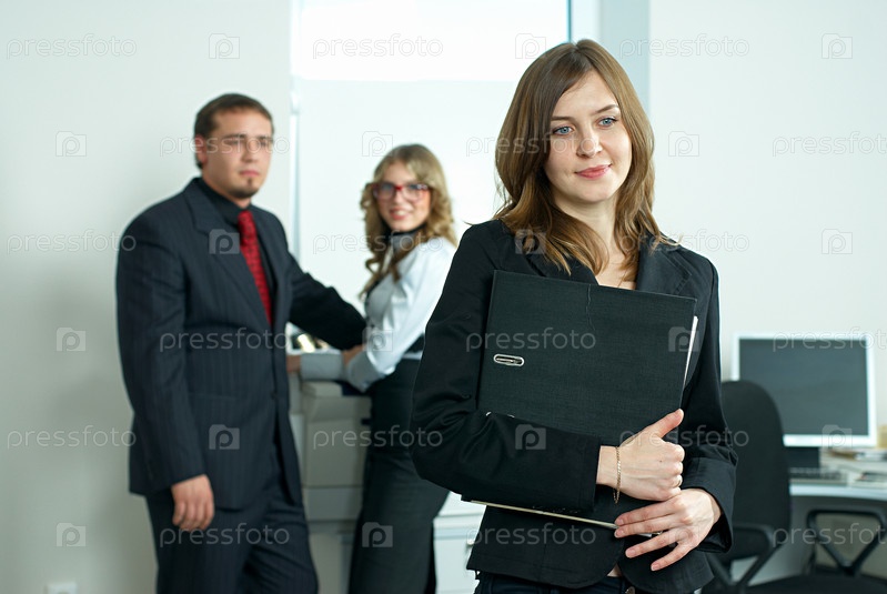 Привлекательная бизнес-леди на фоне коллег в офисе