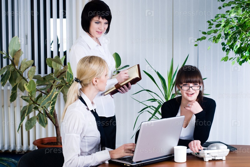 Улыбающаяся команда деловых женщин работает за офисным столом и обсуждает проект на ноутбуке