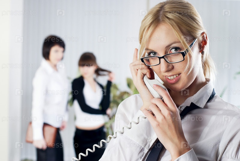 Молодая красивая деловая женщина звонит по телефону в офис