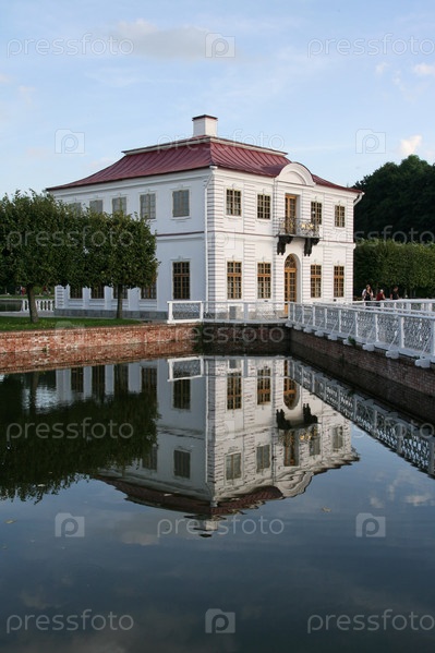Белое двухэтажное здание окруженное деревьями и водоемом