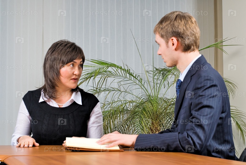 Деловое общение в офисе между бизнесменом и деловой женщиной