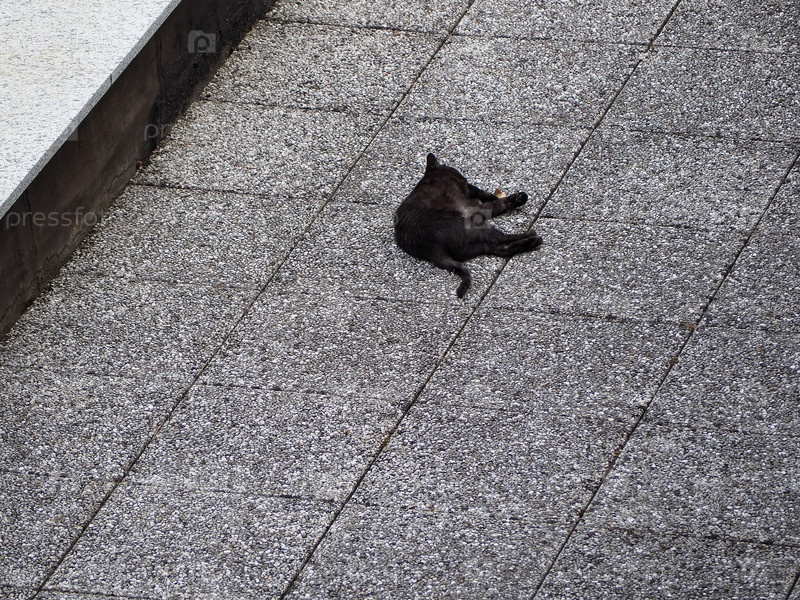 Черная кошка на фоне серого плиточного бетонного пола с копией пространства