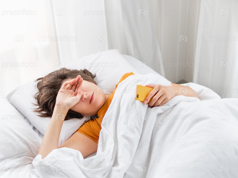Сонная женщина лежит в постели, полностью покрытая белым одеялом. Смартфон используется как будильник. Трудно просыпаться рано утром. Женщина не высыпается