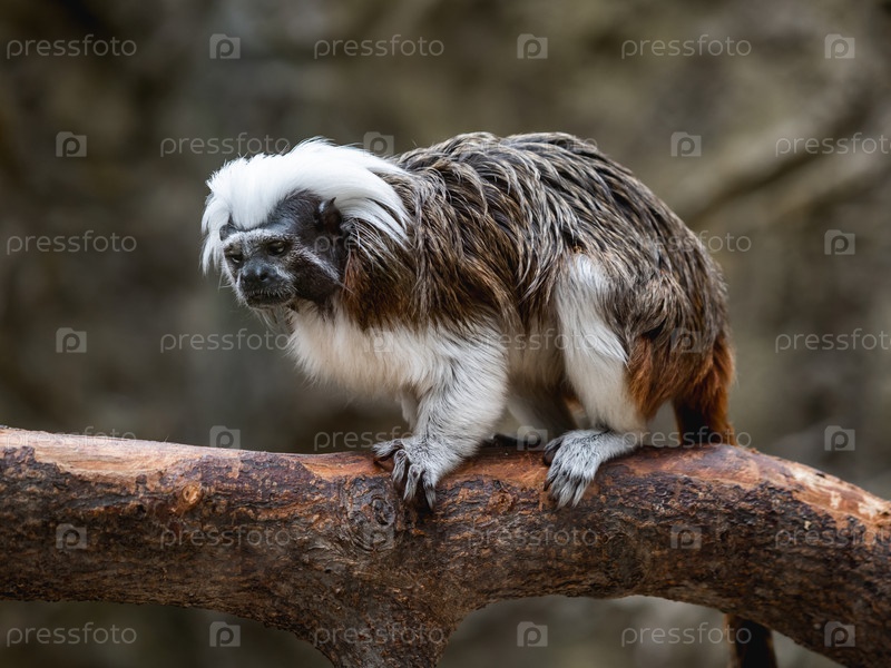 Тамарин с хлопковой верхушкой или Saguinus edipus сидит на ветке дерева. пушистая маленькая обезьяна Нового Света