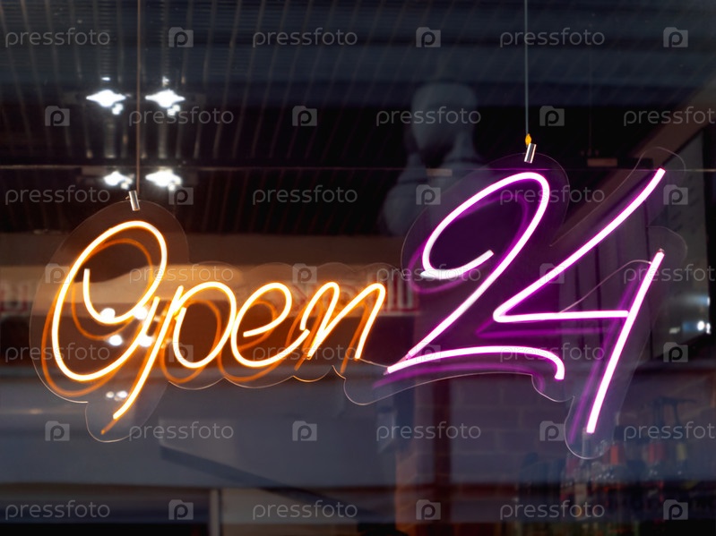 Светящаяся реклама ОТКРЫТА 24 часа в сутки на витрине столовой. Современная электрическая вывеска для привлечения внимания прохожих. Темный интерьер и красочная световая вывеска