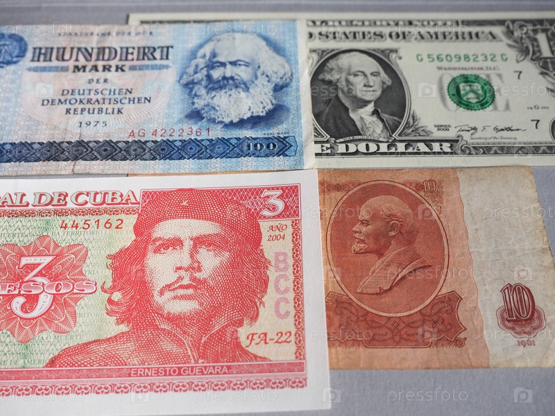 Портреты Маркса, Вашингтона, Че Гевары и Ленина на банкнотах ГДР, США, Кубы и CCCP