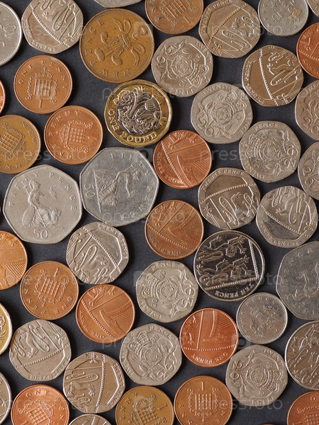 Монеты фунта (GBP), валюта Соединенного Королевства, на черном фоне