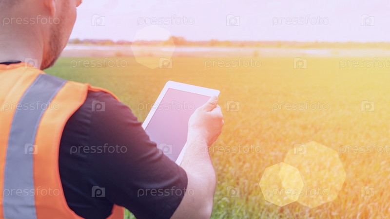 Фермер с белой таблеткой смотрит на зеленые саженцы урожая