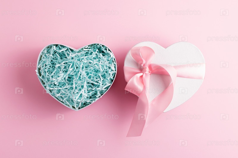 Откройте праздничную подарочную коробку с бумажным наполнителем на пастельно-розовом фоне. Концепция приветствия