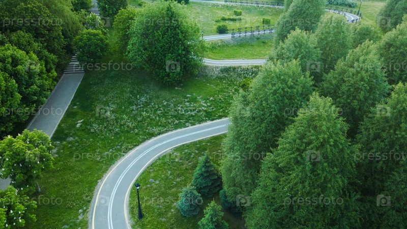 Извилистая велосипедная дорожка. Лежит между деревьями в парке. Фотосъемка с дронов, аэрофотосъемка. Камера наклонена вертикально вниз