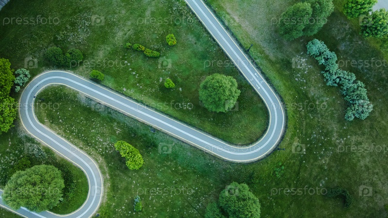 Извилистая велосипедная дорожка. Лежит между деревьями в парке. Фотосъемка с дронов, аэрофотосъемка. Камера наклонена вертикально вниз