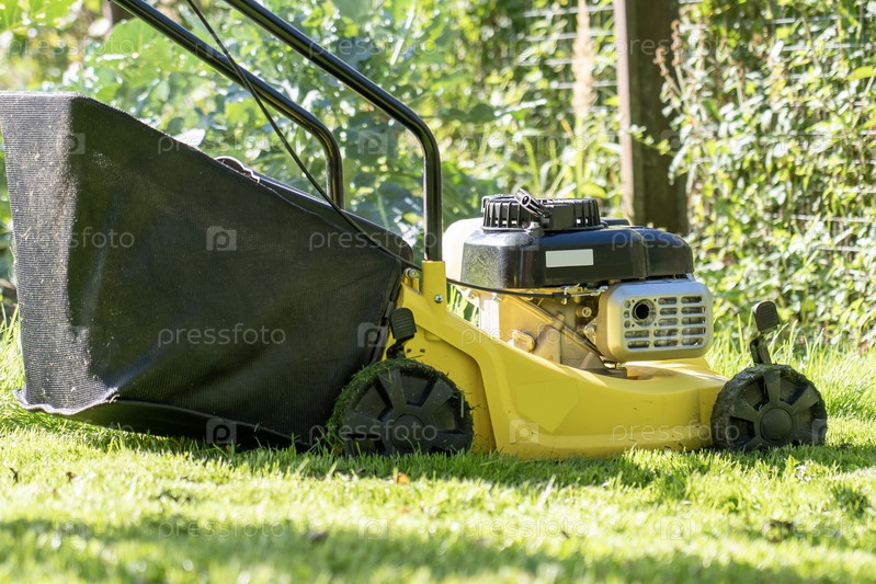 Мужчина косит газон желтой газонокосилкой на заднем дворе, яркое солнце