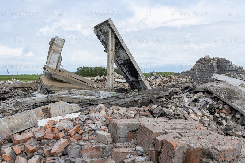Остатки только что демонтированного сельскохозяйственного здания или сооружения на фоне летнего пейзажа. Железобетонные плиты перекрытия и кирпичная крошка лежат на земле