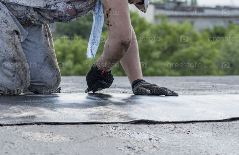 Руки строителя отрезают кусок кровельного материала (рубероид). Ведутся ремонтные работы по укладке мягкой кровли на крышу многоэтажного жилого дома