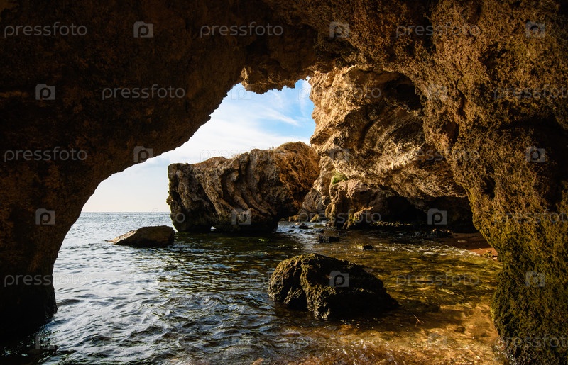 Пещера с видом на море и большие камни на Азовском море в Крыму