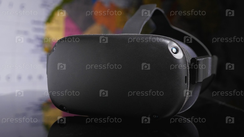 Очки виртуальной реальности с камерами и датчиками на черной зеркальной поверхности на фоне карты мира.Современный VR-шлем для работы и учебы