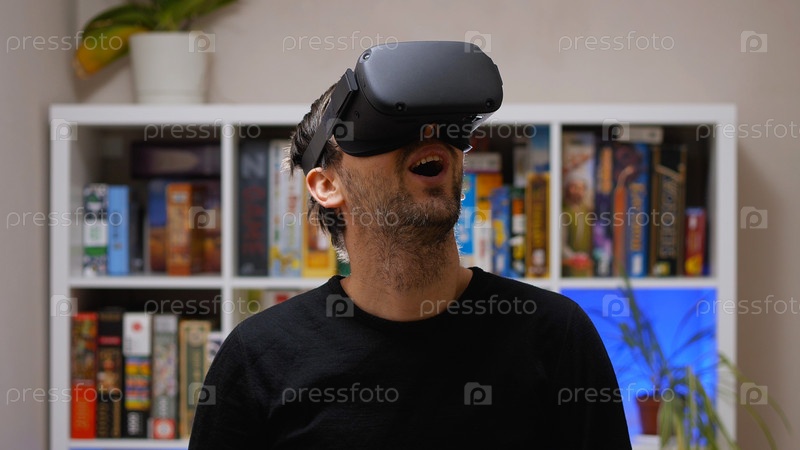 Бородатый мужчина стоит в комнате в очках виртуальной реальности с удивленно открытым ртом. На заднем плане стойка с настольными играми. Шлем виртуальной реальности для развлечений, обучения и игр