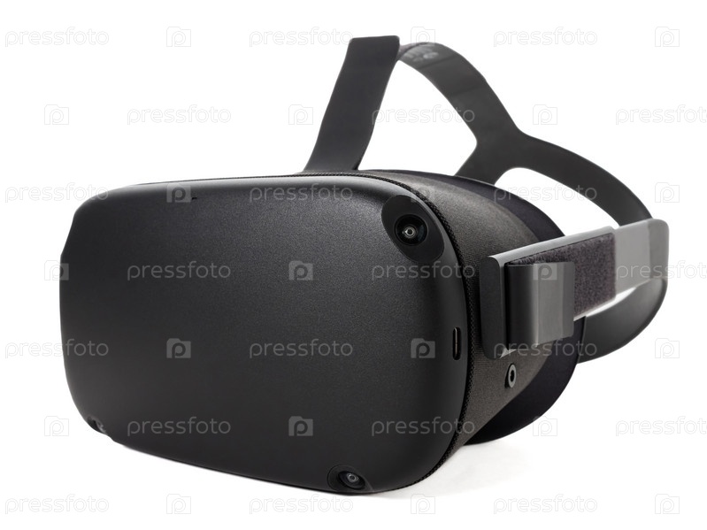 Большой план современного шлема VR, изолированного на белом фоне. Боковой вид спереди. Очки виртуальной реальности для игр, развлечений и обучения