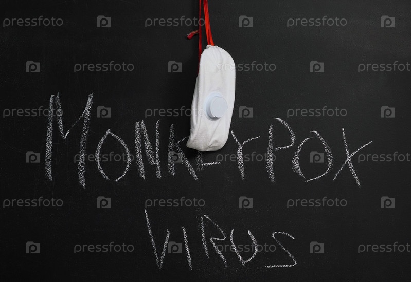 Белая защитная маска висит на черной доске, где мелом написано вирус обезьяньей оспы. В мире вспышка обезьяньей оспы. Новая глобальная эпидемия