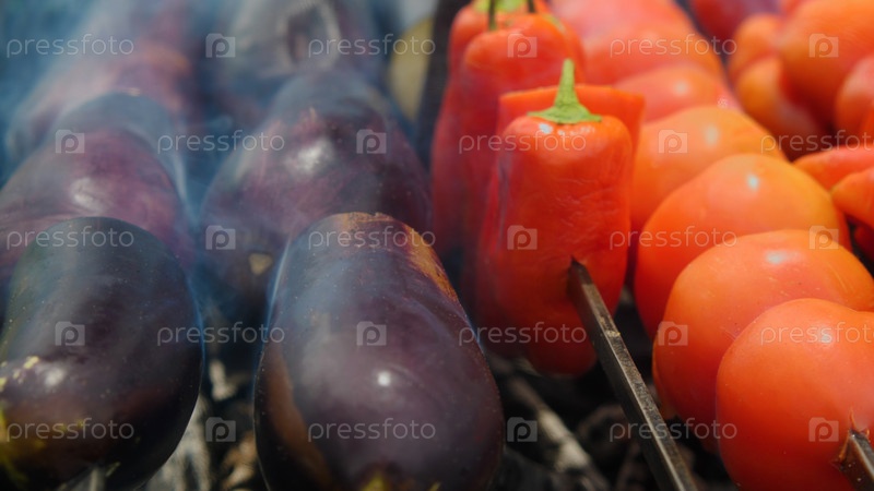 Крупный план свежих овощей на гриле. Баклажаны, перец и помидоры на шпажках обжариваются на углях в гриле. Приготовленный аджапсандали, традиционное грузинское блюдо