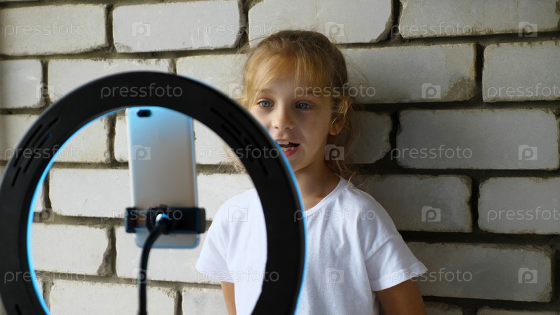 Симпатичная блондинка-блогер, стоящая перед смартфоном и кольцевой лампой, рассказывает историю в видео. Ребенок ведет видеоблог, стоя перед белой кирпичной стеной. Ведение домашнего блога