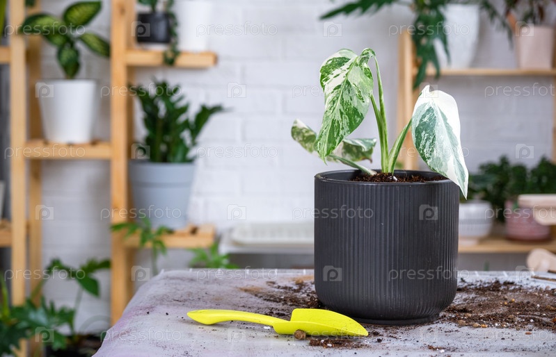 Пересадка домашнего растения монстера белая пестрая с комком корней в новый горшок большего размера. Уход за растением в горшке, раскладка на столе с почвой, лопатой, декоративным цветочным горшком, макетом