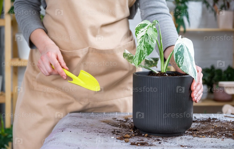 Пересадка домашнего растения монстера белая пестрая с комком корней в новый горшок большего размера. Уход за растением в горшке, руки женщины в фартуке, макет