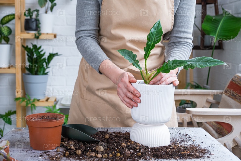 Пересадка домашнего растения филодендрона с комком корней в новый горшок большего размера. Уход за растением в горшке, руки женщины в фартуке, макет