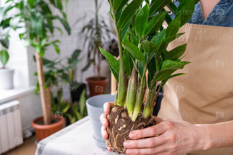 Пересадка разросшегося домашнего растения сочного замиокулькаса с комком корней и луковицы в новый горшок большего размера. Уход за растением в горшке, руки женщины в фартуке, макет