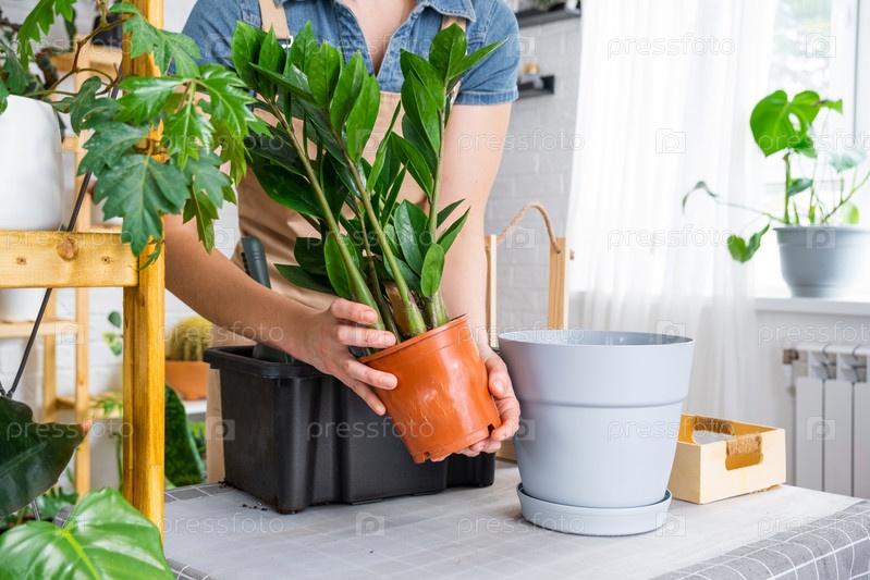 Пересадка разросшегося домашнего растения сочного замиокулькаса в новый горшок большего размера. Уход за растением в горшке, руки женщины в фартуке, макет