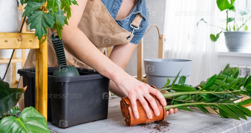 Пересадка разросшегося домашнего растения сочного замиокулькаса в новый горшок большего размера. Уход за растением в горшке, руки женщины в фартуке, макет