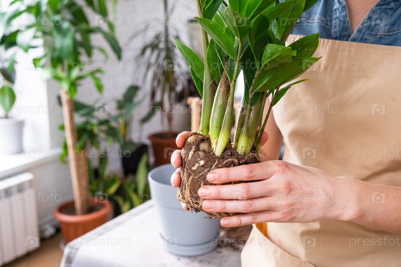 Пересадка разросшегося домашнего растения сочного замиокулькаса с комком корней и луковицы в новый горшок большего размера. Уход за растением в горшке, руки женщины в фартуке, макет