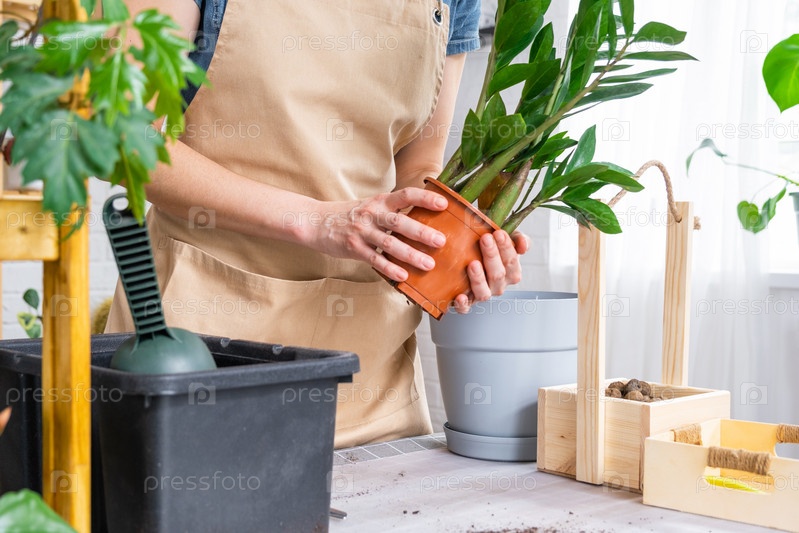 Пересадка разросшегося домашнего растения сочного замиокулькаса в новый горшок большего размера. Уход за растением в горшке, руки женщины в фартуке, макет