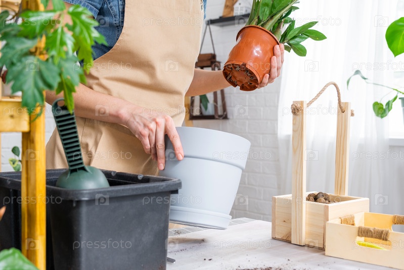 Пересадка разросшегося домашнего растения сочного замиокулькаса в новый горшок большего размера. Уход за растением в горшке, руки женщины в фартуке, макет