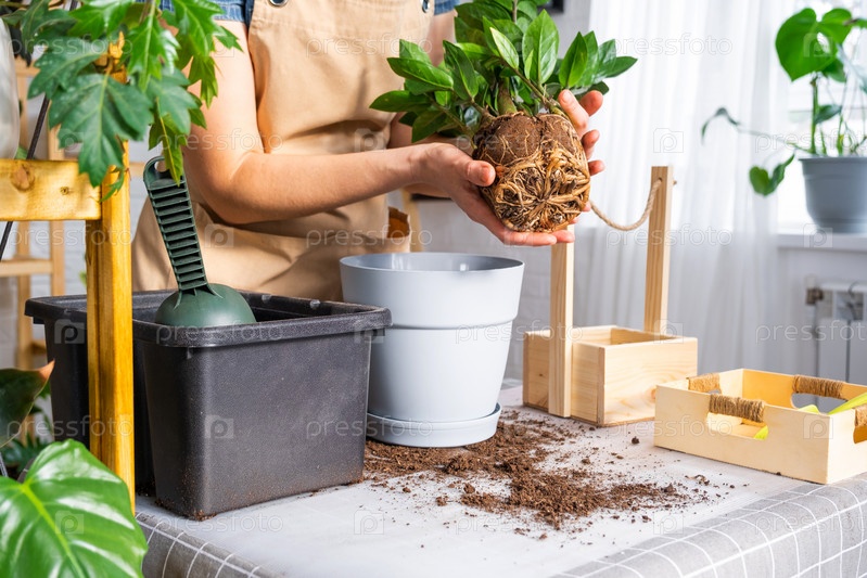 Пересадка разросшегося домашнего растения сочного замиокулькаса с комком корней и луковицы в новый горшок большего размера. Уход за растением в горшке, руки женщины в фартуке, макет