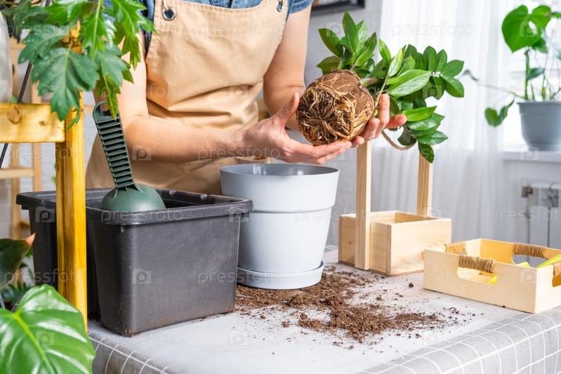 Пересадка разросшегося домашнего растения суккулентного замиокулькаса с комком корней и луковицы в новый горшок большего размера. Уход за растением в горшке, руки женщины в фартуке, макет