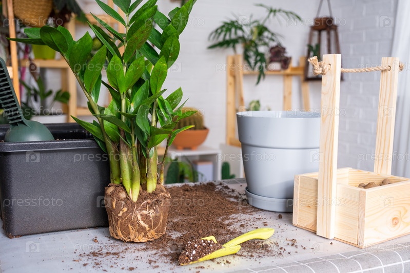 Пересадка домашнего растения суккулентного замиокулькаса в новый горшок. Уход за горшечным растением, раскладка на столе с почвой, лопатой, декоративным цветочным горшком