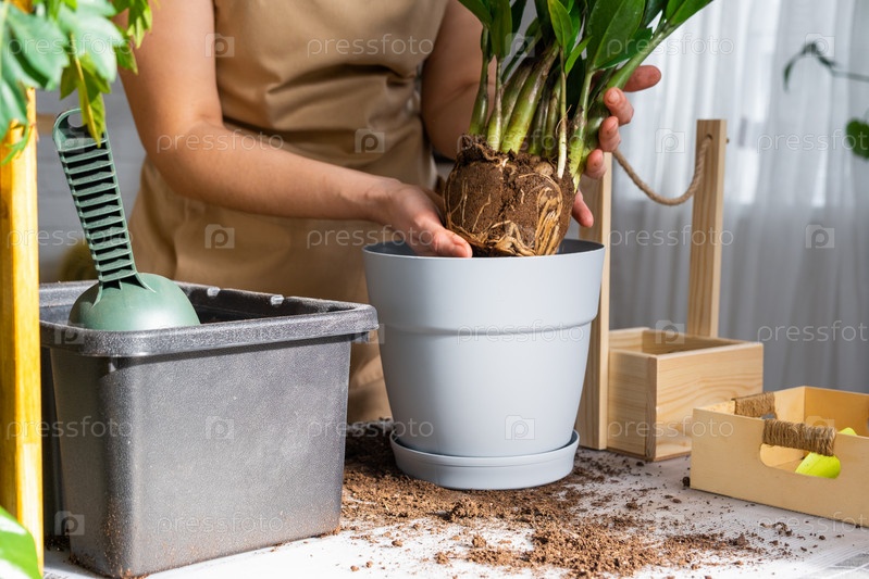 Пересадка разросшегося домашнего растения суккулентного замиокулькаса с комком корней и луковицы в новый горшок большего размера. Уход за растением в горшке, руки женщины в фартуке, макет